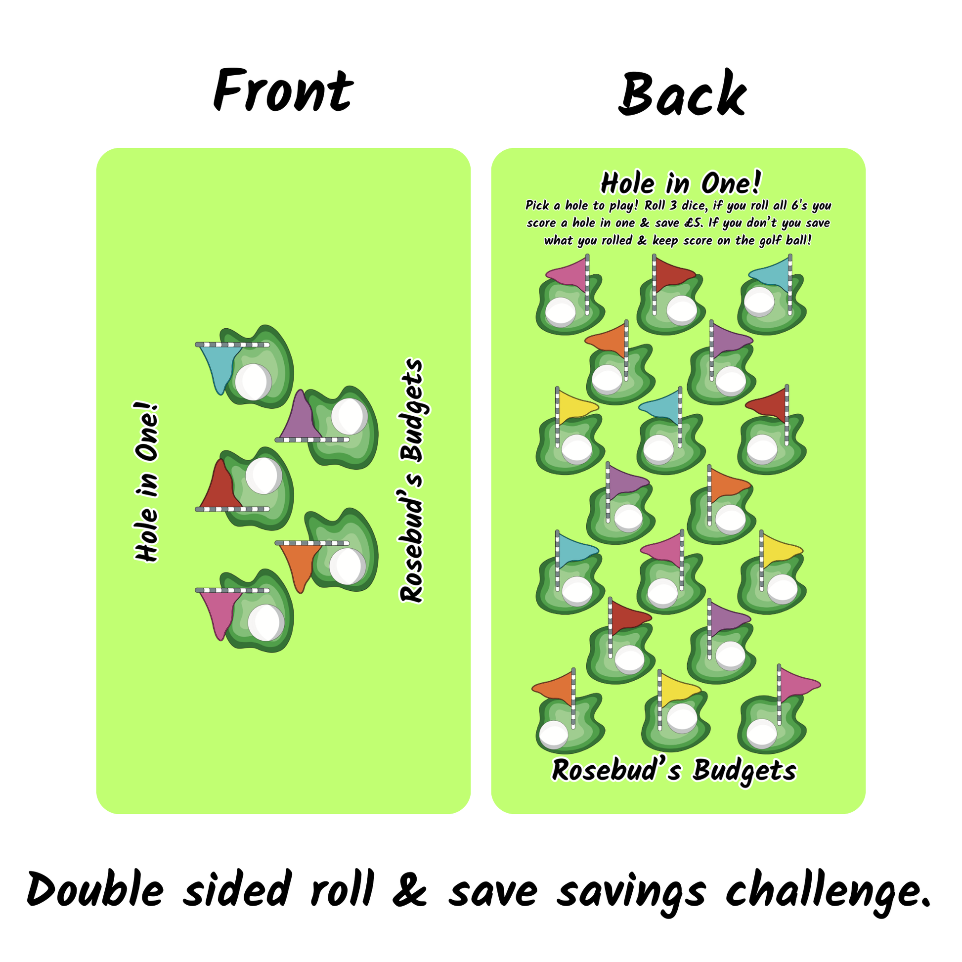 Start by picking a hole to play. Then roll three dice and if you roll three 6's save £5. If you don't roll three 6's save the amount rolled and write the amount on the golf ball to keep track! Happy savings. How much will you save with this challenge?
