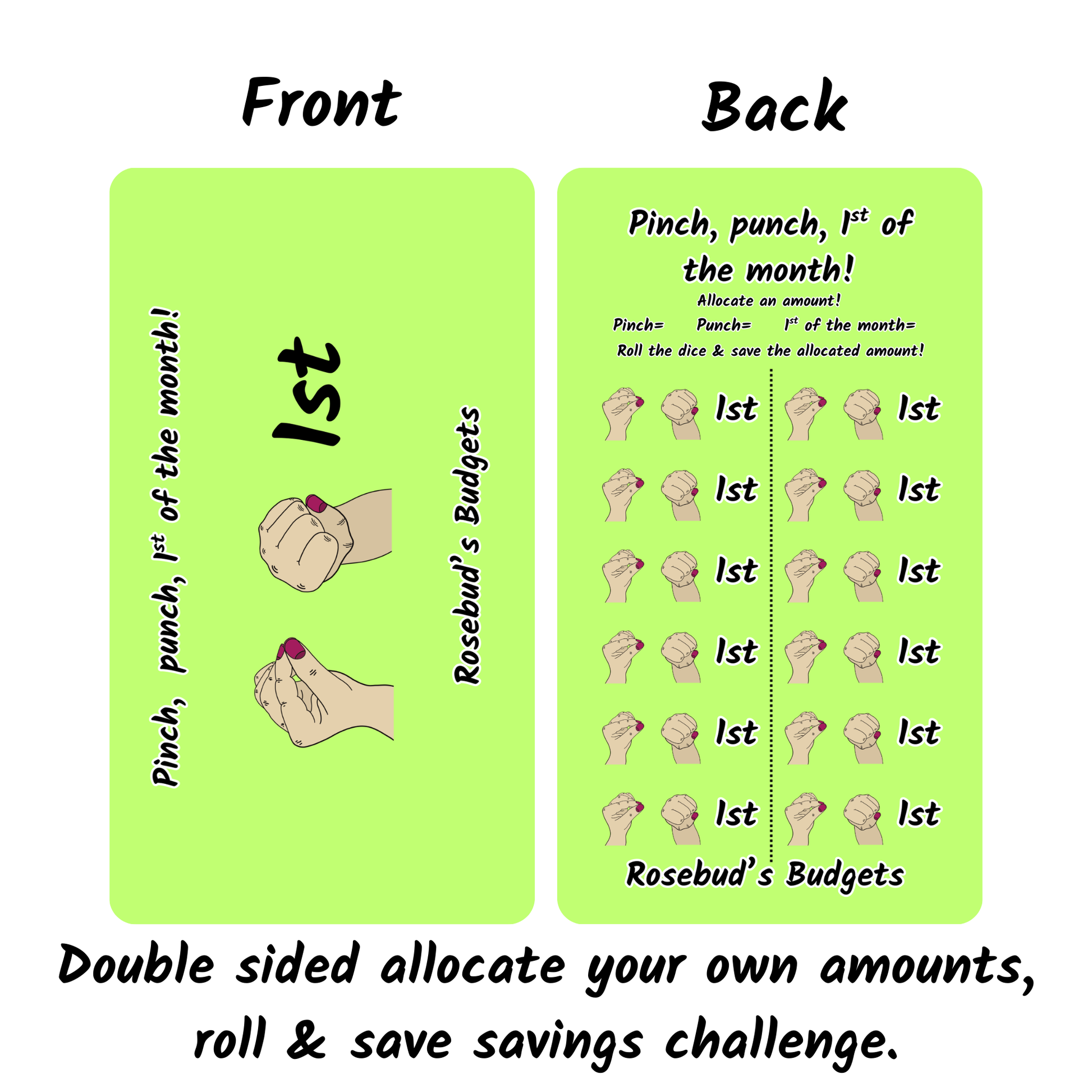 Start by allocating each pinch, punch & 1st of the Month an amount. Roll the dice provided and save the amount allocated to what you roll. Happy savings. How much will you save with this challenge? Tag me at Rosebudsbudgets over on Instagram.