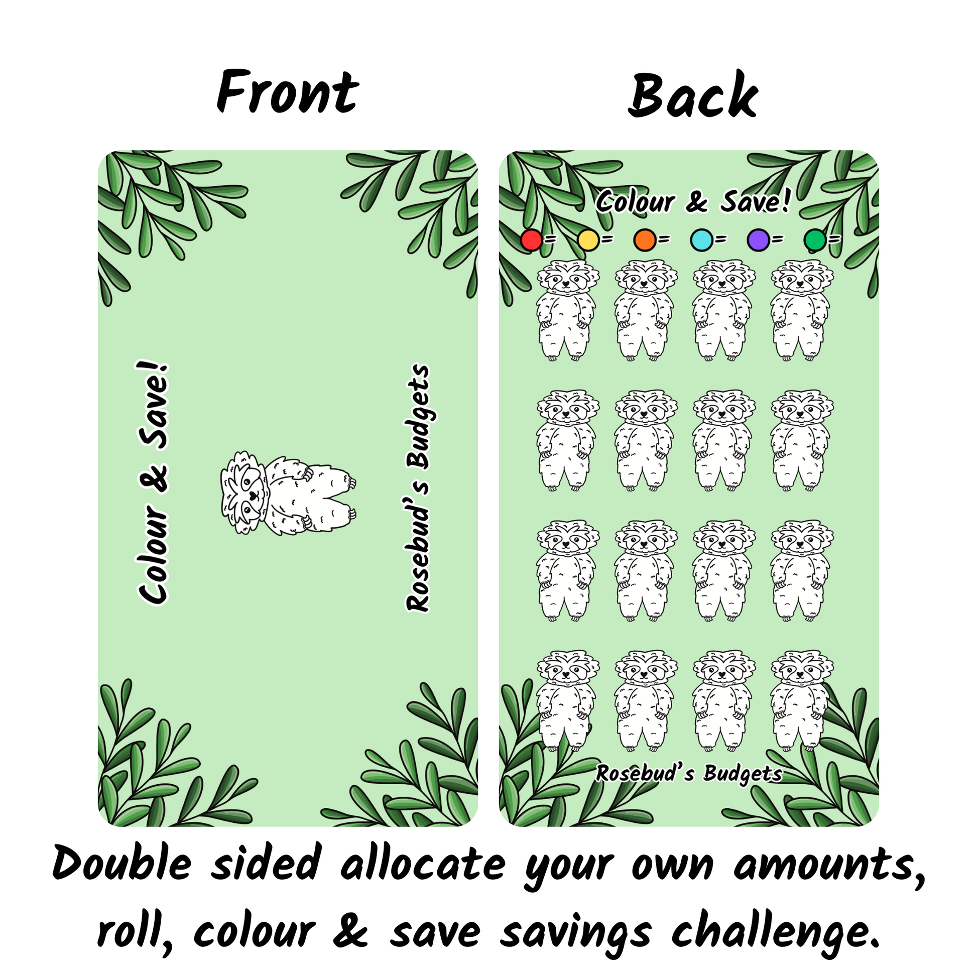 This listing is for the Colour & save! Sloth themed double sided, fun dash & saving challenge. (6 sided colour dice not included but can be purchased separately)